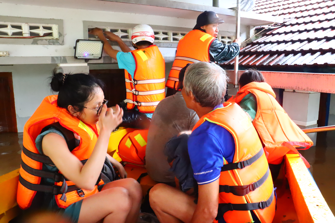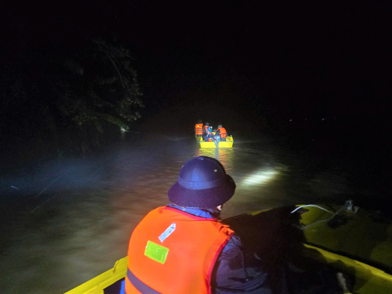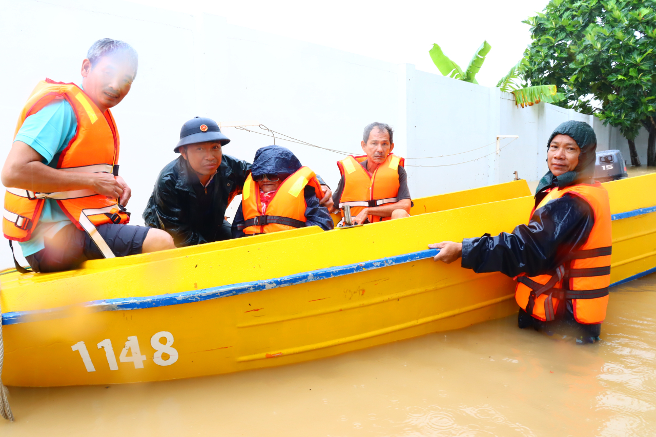 Những ngôi nhà ngập gần đến mái, được cán bộ, học viên tiếp cận đưa người già, trẻ nhỏ lên xuồng ra khu an toàn