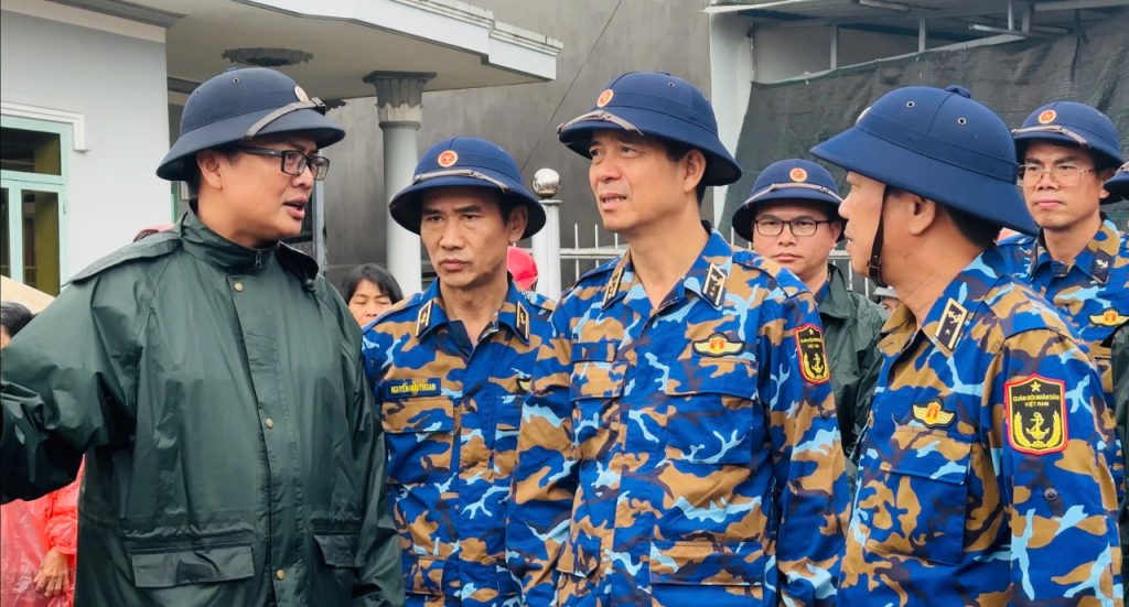 Phó Đô đốc Nguyễn An Phong, Bí thư Đảng uỷ, Chính ủy Hải quân đến nắm tình hình và động viên cán bộ, học viên của Học viện Hải quân giúp đỡ nhân dân sáng 20/11